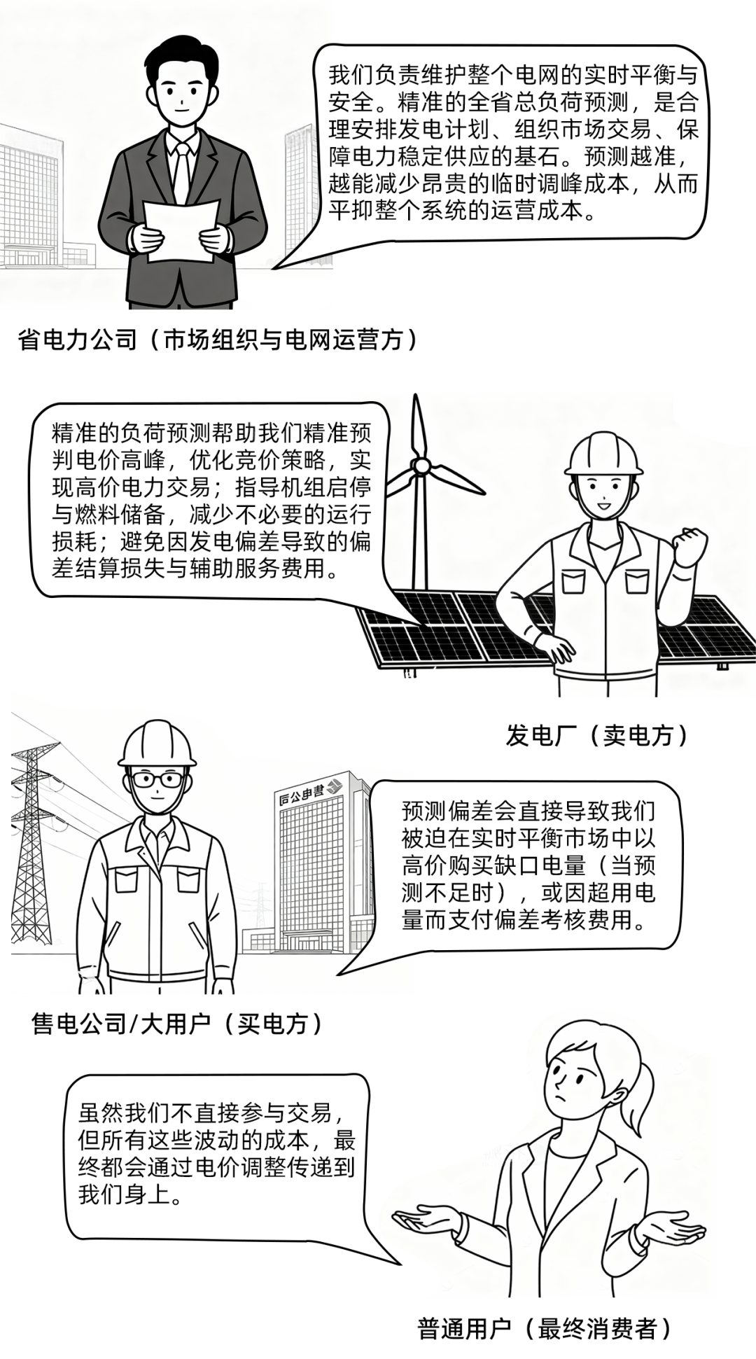 无论是发电厂的售电报价,还是售电公司的购电策略,都始于对未来电力需求的预判。因此,各方负荷预测的准确性,共同决定了市场出清价格的合理性,是影响各方收益与市场效率的先决条件。